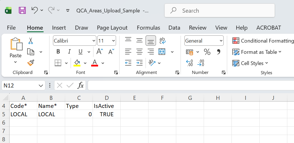 Example: below Excel, Areas and Name is Local, Type is Both, and this Area code is Active.