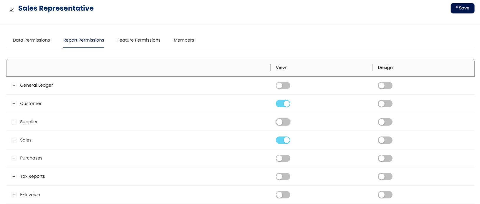 For example, if want to create user role for sales representative which can let sales person to issue sales transaction and view sales report but not allow to delete then can tick for all permission except Delete