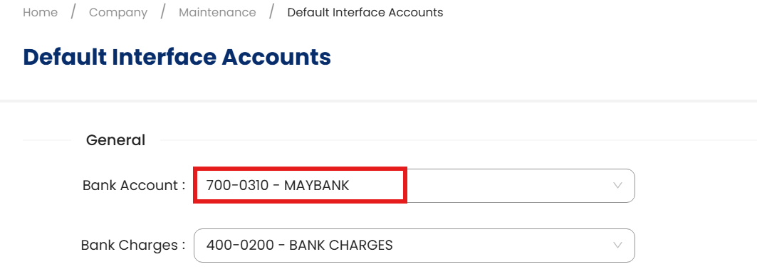 then Expand General Ledger > Press Chart of Account > then look for Account code '700-0330', insert Bank Account No.