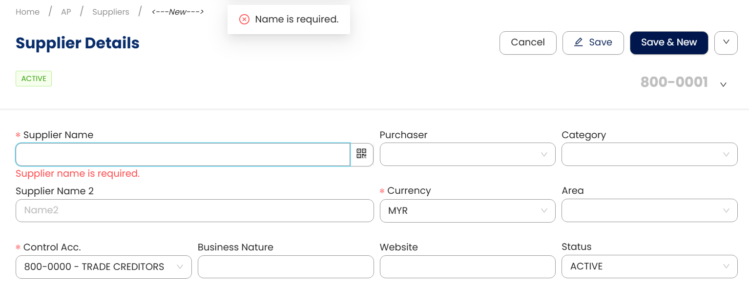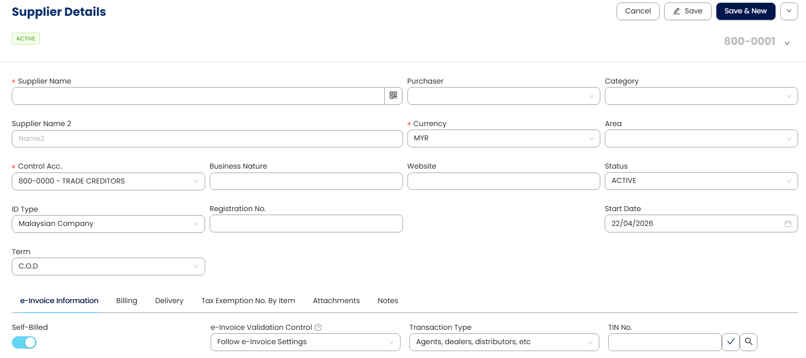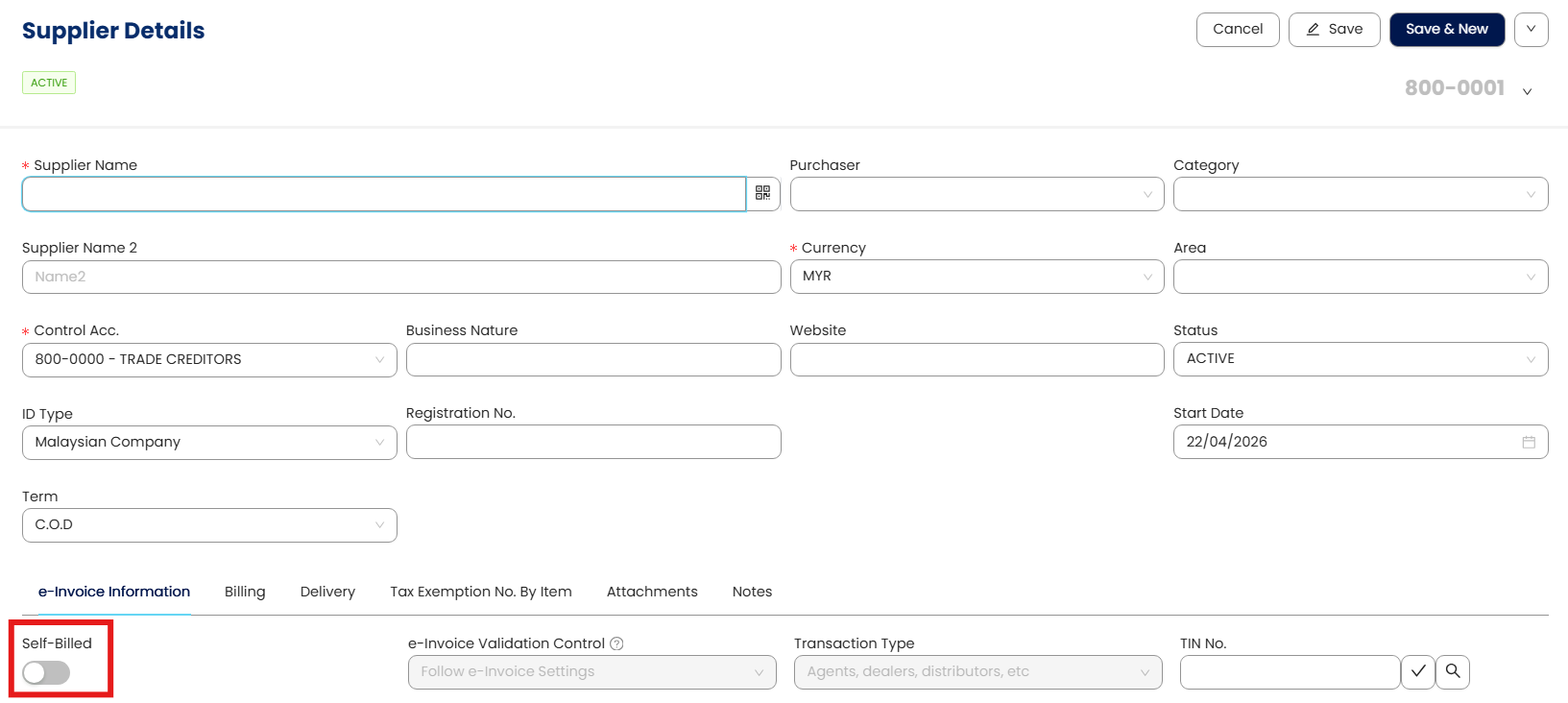 In N3 AI Accounting (formerly QNE AI Cloud Accounting), you can create supplier profiles specifically for submitting self-billed e-Invoices by ensuring that all required supplier details are accurately filled in, in compliance with LHDN requirements. Only suppliers marked as Self-Billed will be eligible for self-billed e-Invoice submission when selected in a purchase transaction.