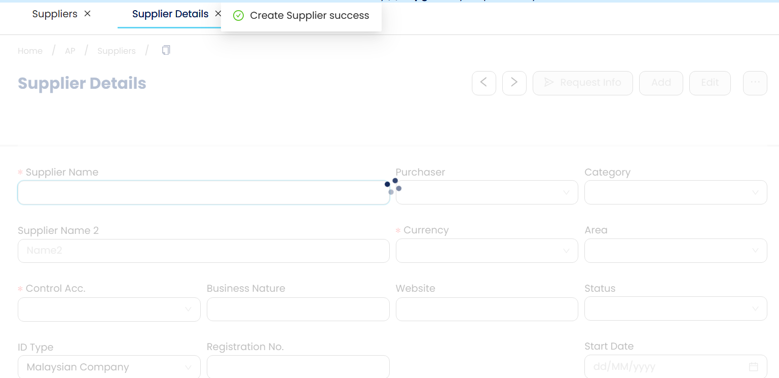 You will be prompted with the Supplier creation platform. Click on Add.