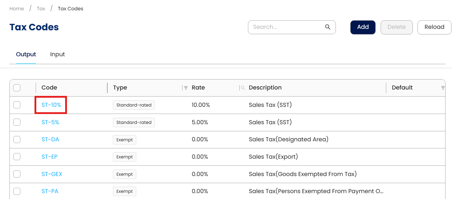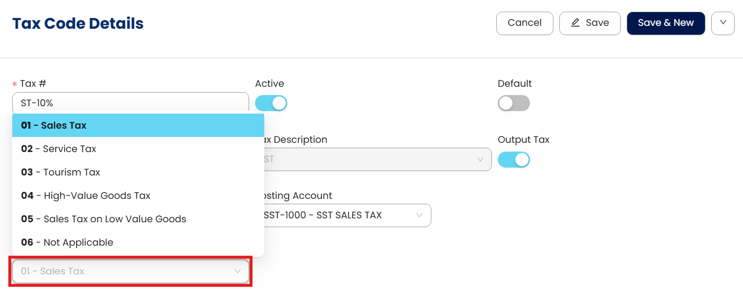 Click on Edit and click on the drop-down menu for e-Invoice Tax Type. Select the tax type for the tax code. Click Save after selecting the tax type.