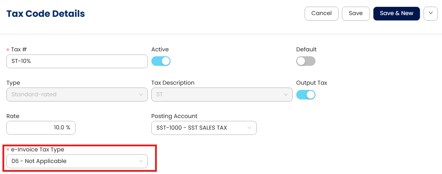 Users should see the details of the Tax Code. From here, the e-Invoice Tax Type appears as an important field to be filled.