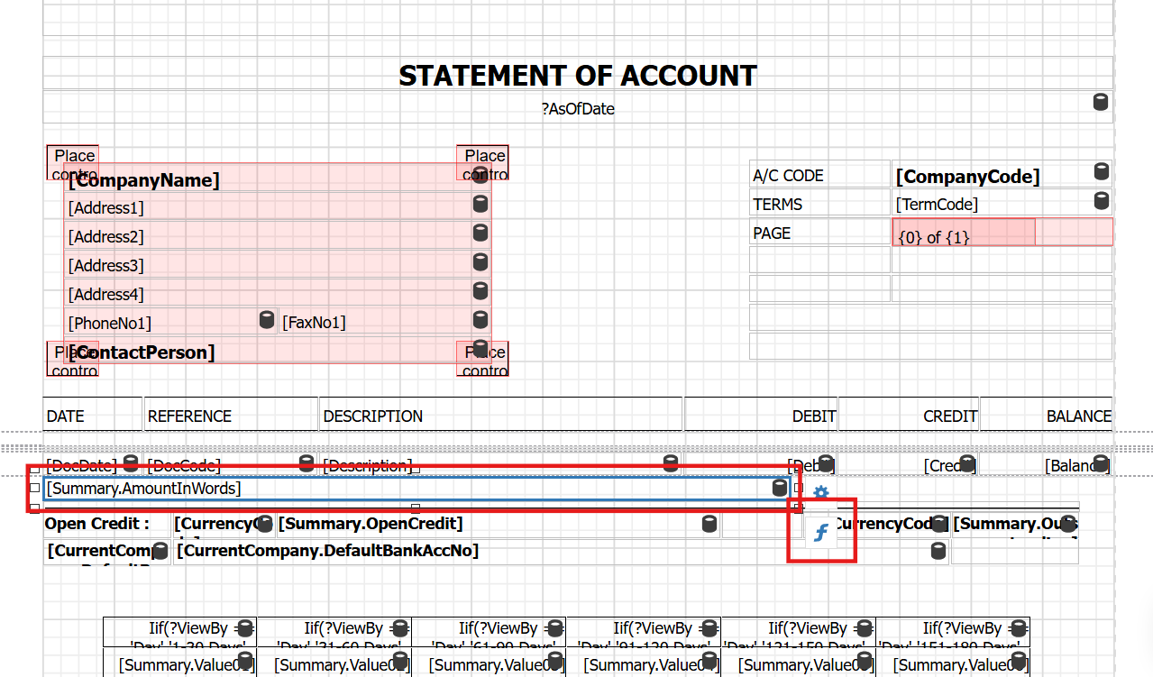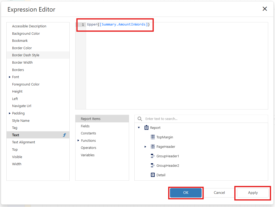 Step 2 - In the Report Designer, click on the "Amount in Words" field, then click the "Expression" button