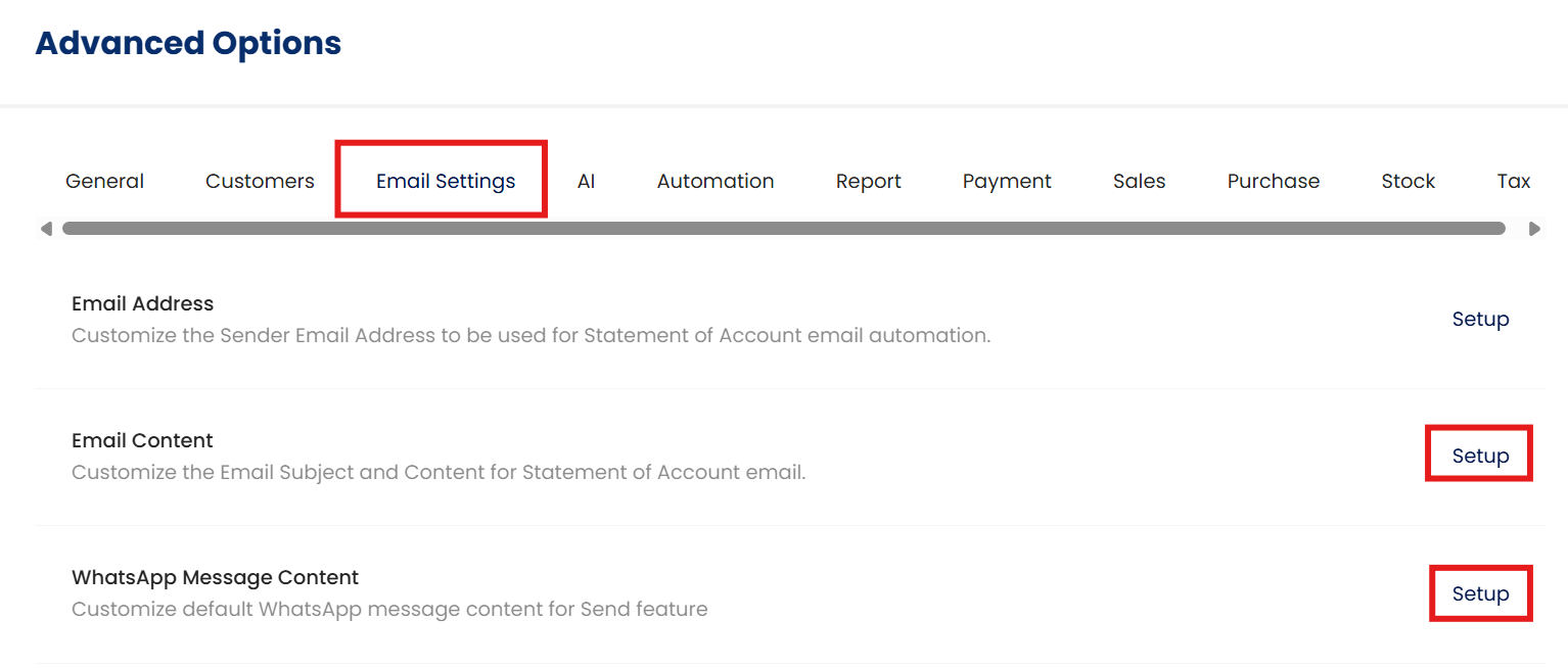 Click on Email Settings and click setup on Email Content or WhatsApp Message Content to amend