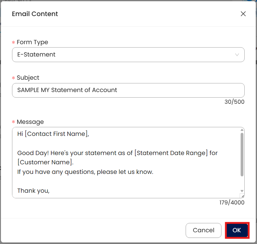 Batch Email function only available for Statement of Account and E invoice transaction at the moment, so may select E-Statement or E-invoicing to change email content