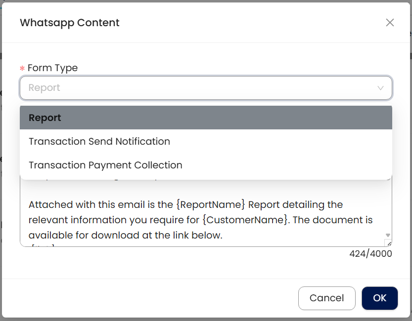 User can amend WhatsApp content for Report, Transaction Send Notification and Transaction Payment collection