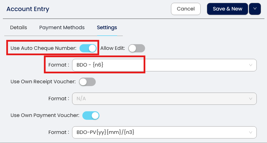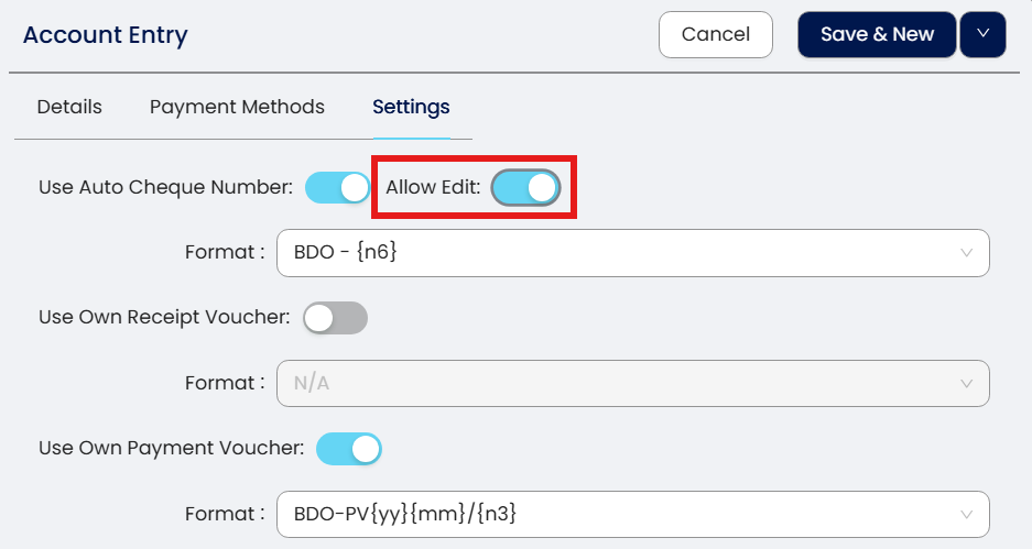 Toggle ON the Allow Edit option for either bank account if users need the ability to manually override auto-generated cheque numbers.
