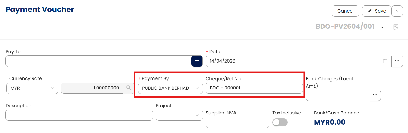 Cheques from Public Bank automatically follow the sequence: BDO-000001, BDO-000002, etc.