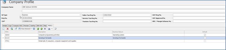 1. File > Company Profile > To add new MSIC codes click the add button