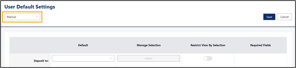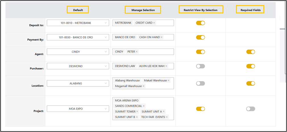 - Restrict View By Selection: When enabled, this toggle hides all unlisted values from the user's view. The user will only see and interact with the selections defined under Manage Selection. (Except for Deposit To and Payment By)