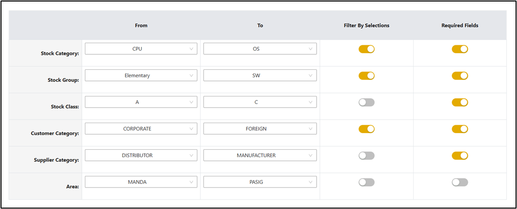 - Filter By Selections: When toggled ON, this enables an auto-filtering mechanism in reports based on the From/To filters set on transactions. But the selection can still be changed by the user.