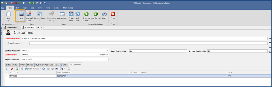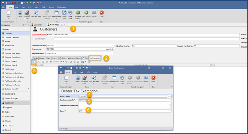 Tax Exemption > Click New. Select the Stock / Services > Update the customer ‘Tax Exemption Number’ > select Tax Code > Save - Notice that the Exempted item is recorded, then click Save