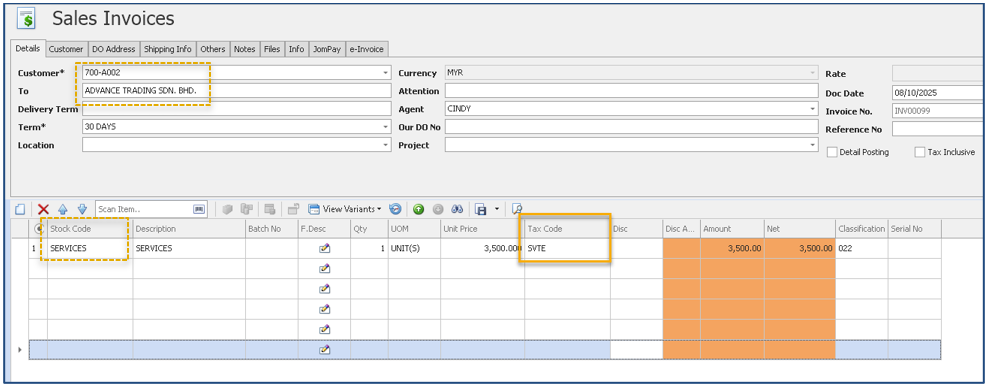 3. Once the customer and item are selected in a transaction, the system will automatically display the default tax code.