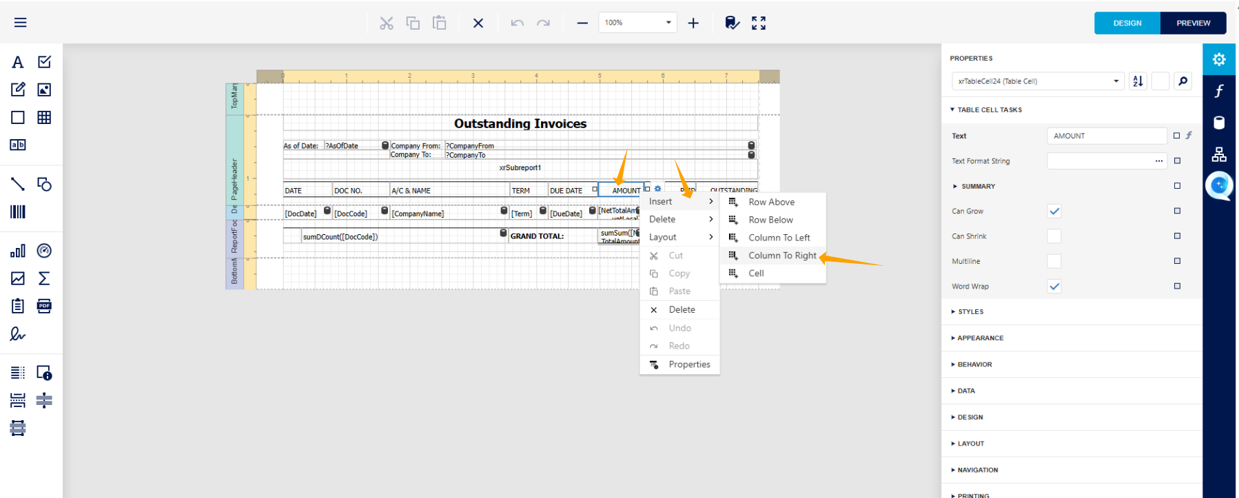 Now you can see that an additional table cell has been added to the Amount column in both the Page Header and the Details Band. Users can then adjust the size of the new column as needed.