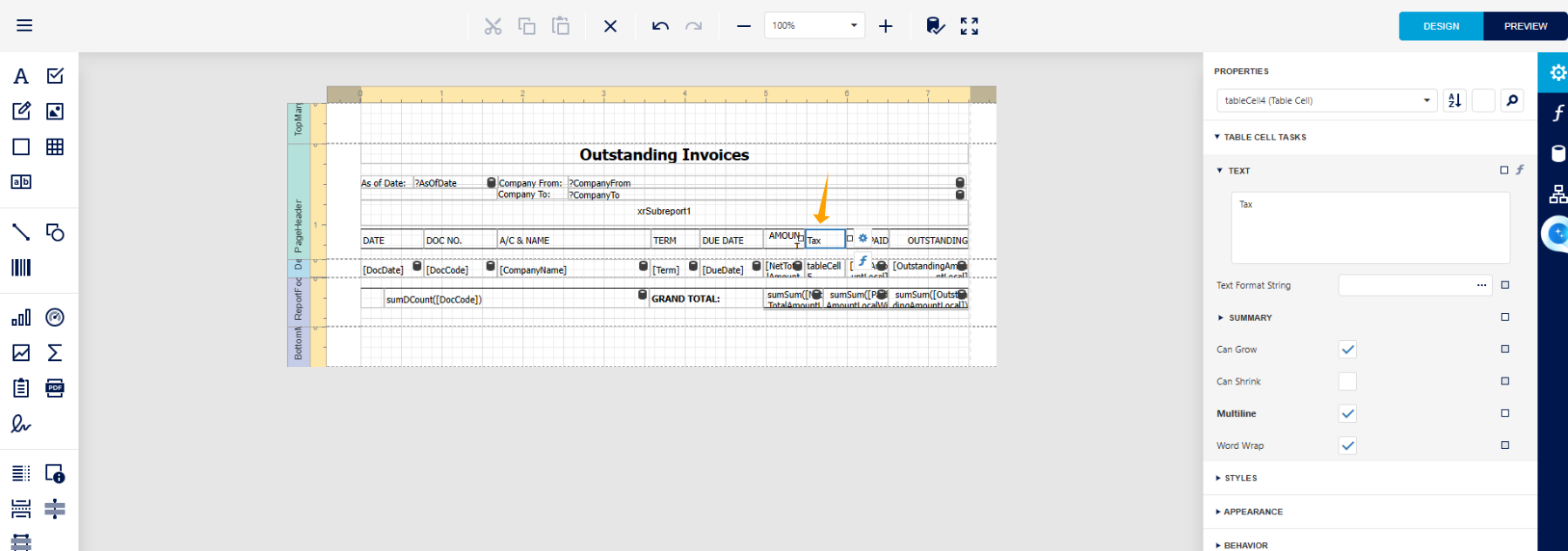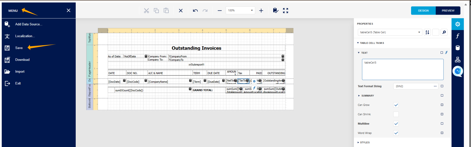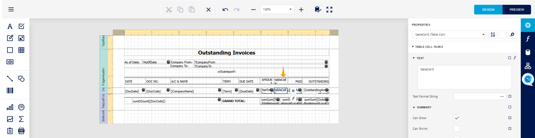 We have now entered the Report Designer page of the Outstanding Invoice Report.