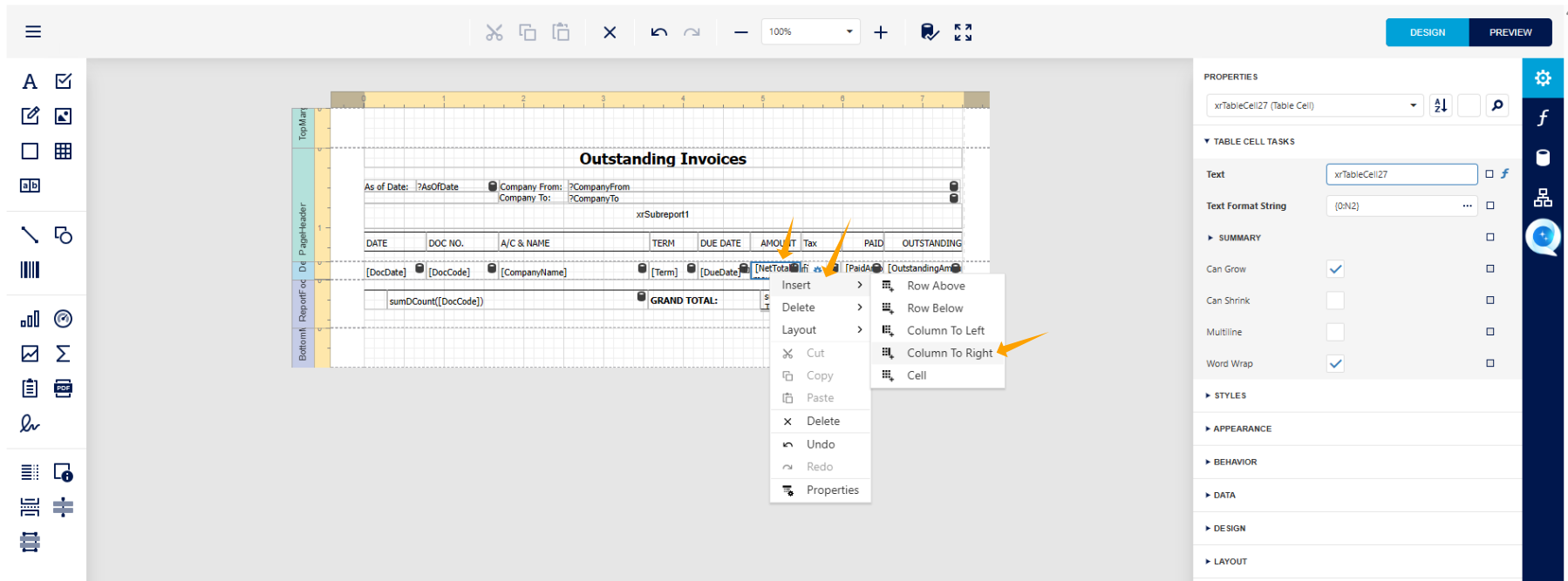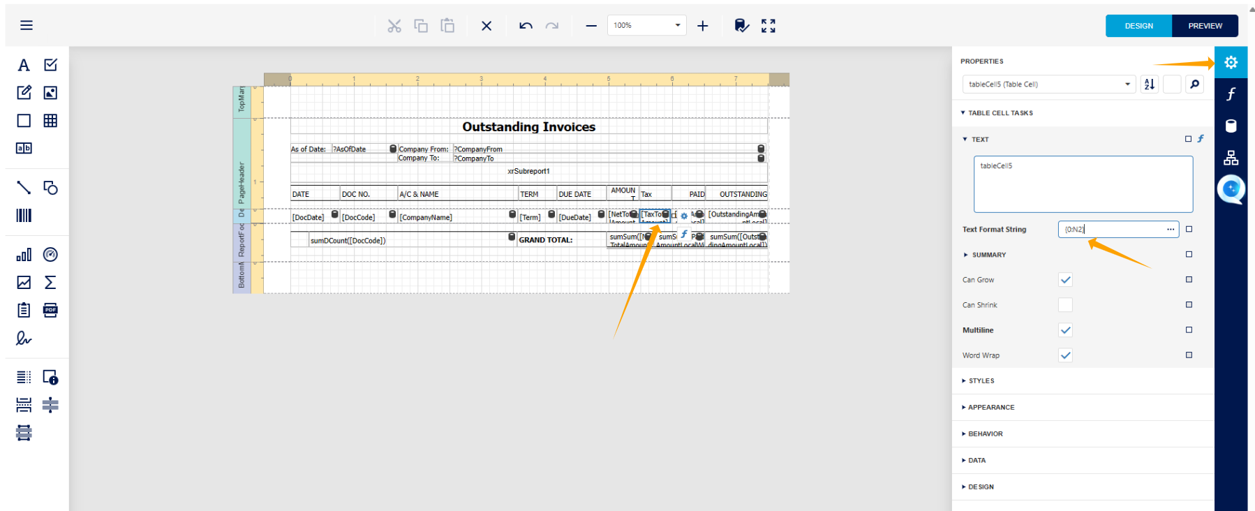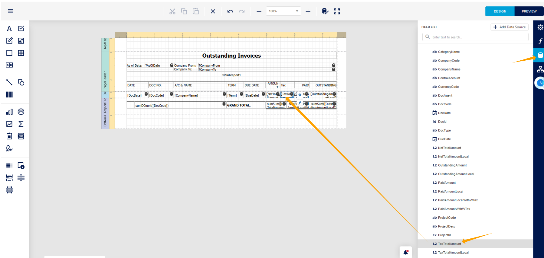 We have now entered the Report Designer page of the Outstanding Invoice Report.
