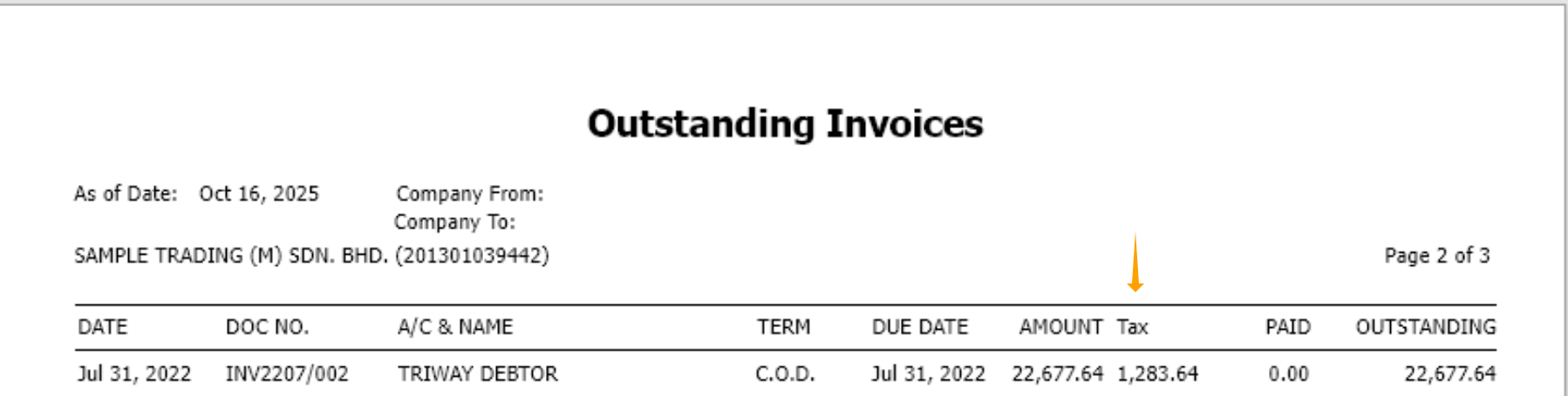 Adding the Tax Amount column allows users to have a clearer view of the tax portion for each outstanding invoice — useful for reconciliation, SST reporting, and accounting accuracy.