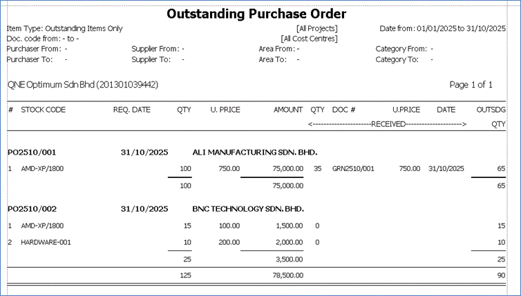 This report displays all purchase orders (PO) that have been issued but are not yet fully received. It helps track pending deliveries from suppliers by showing the quantities ordered, received, and still outstanding.