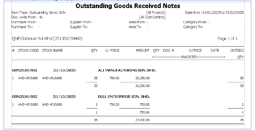✅ Report Path: (Optimum) - View > Reports > Purchase Report > Report > Outstanding Goods Received Notes