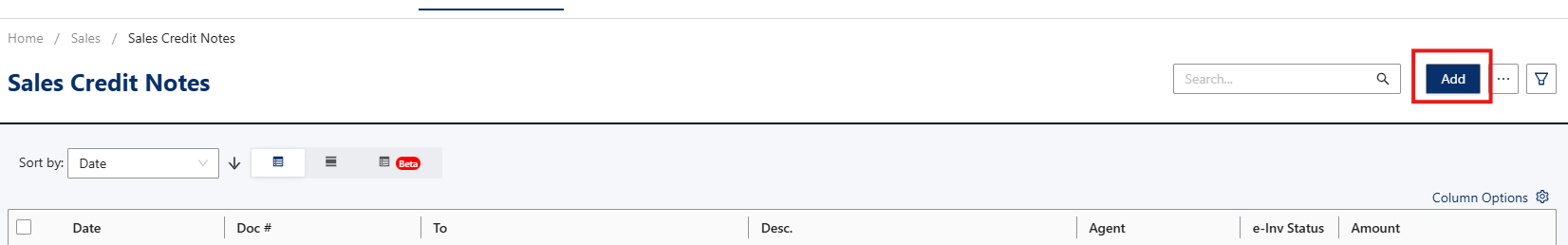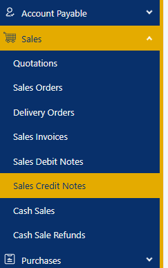 In the navigation screen (left-hand side), click Sales > Sales Credit Note and click on Add button to issue new Sales Credit Note.