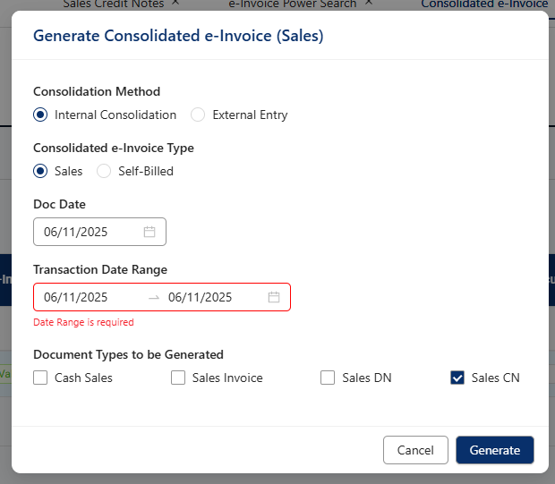 Click on add button, ticked Sales CN and click on the Generate button to generate consolidated credit note.