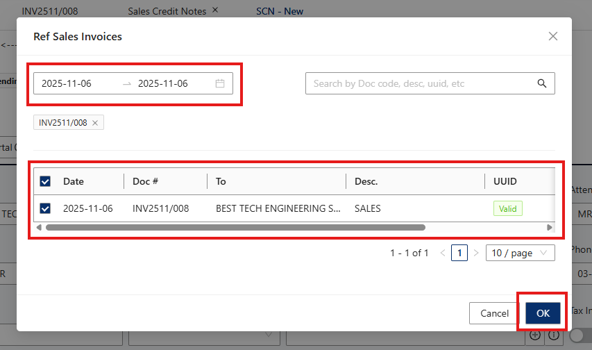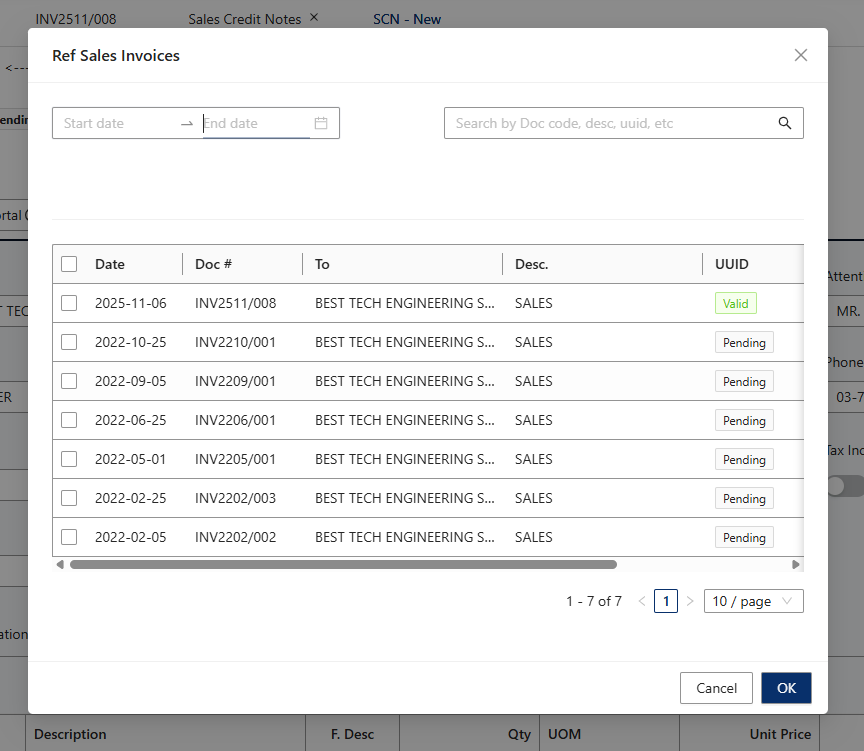 No worries! You can find the UUID of the related document in the Ref. Sales Inv fields. Click on Add icon button to view the documents detailsYou may use the date filter or UUID field to find the related document. In this example, we’re using a date filter. You can select the document and proceed to click the OK button.