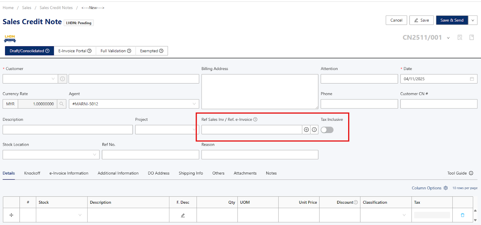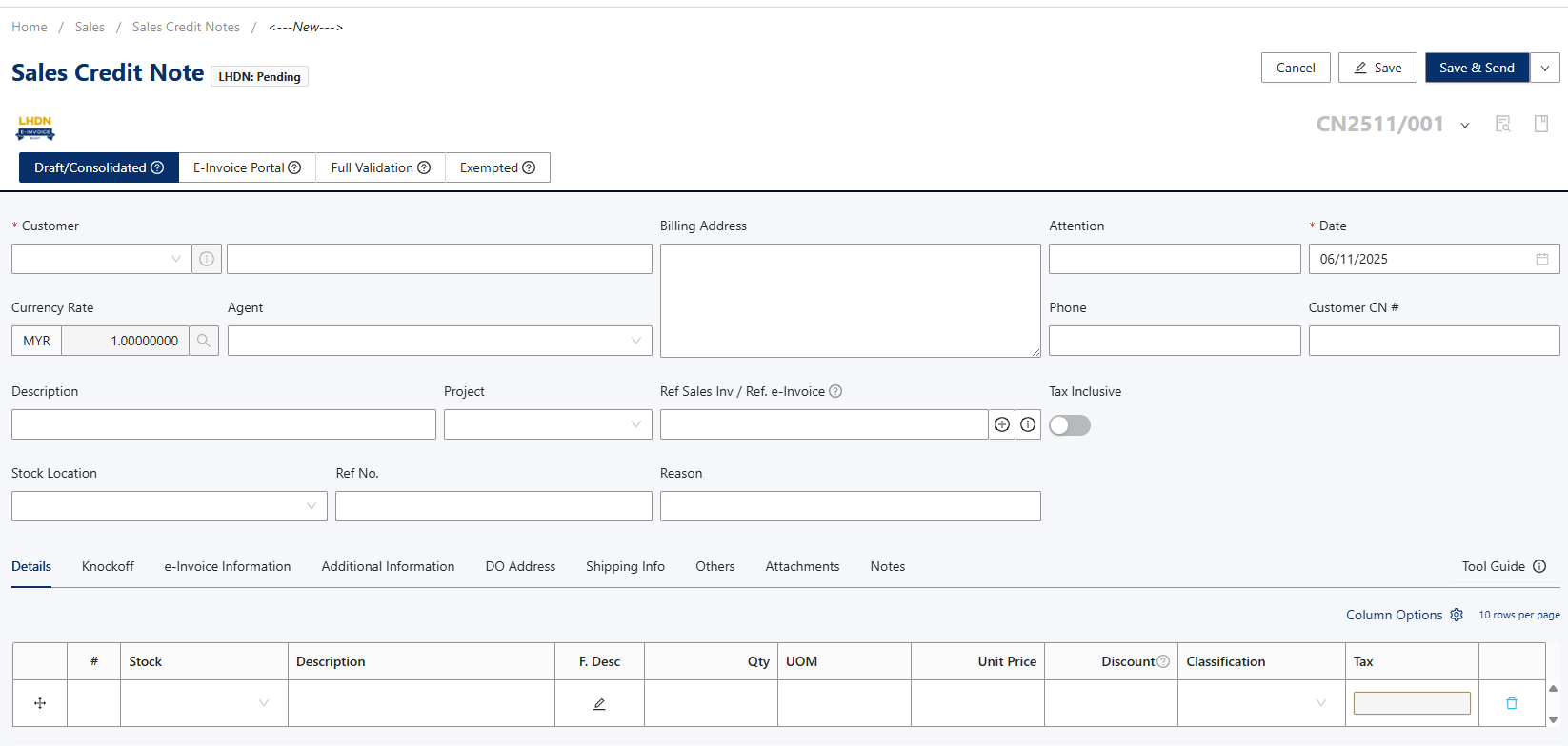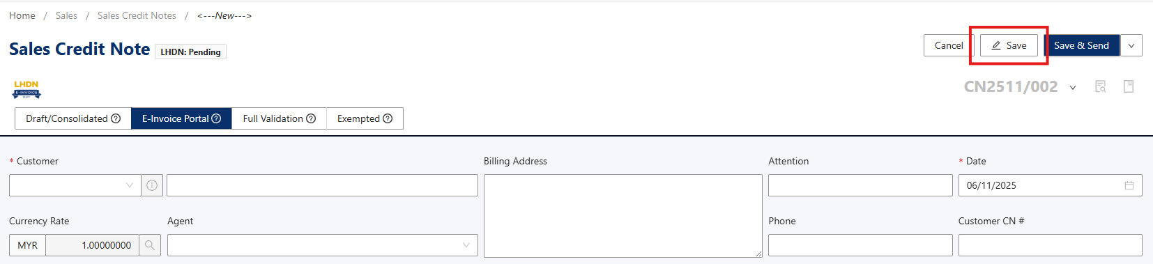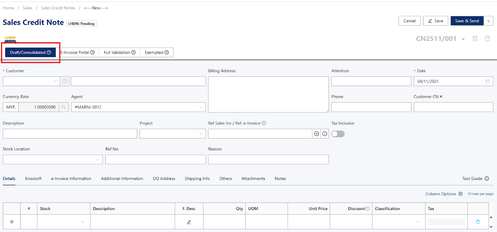 Note: You can only use “Valid” documents as reference in issuing Consolidated Credit Note.Once details have been completed, you can proceed to click on the Save button.