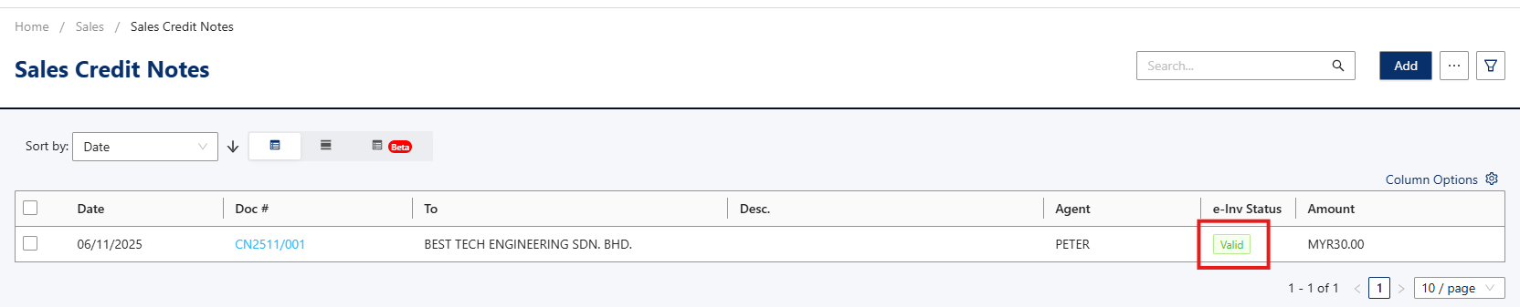 In the Sales Credit Notes list, the document status will be updated as “Valid”.