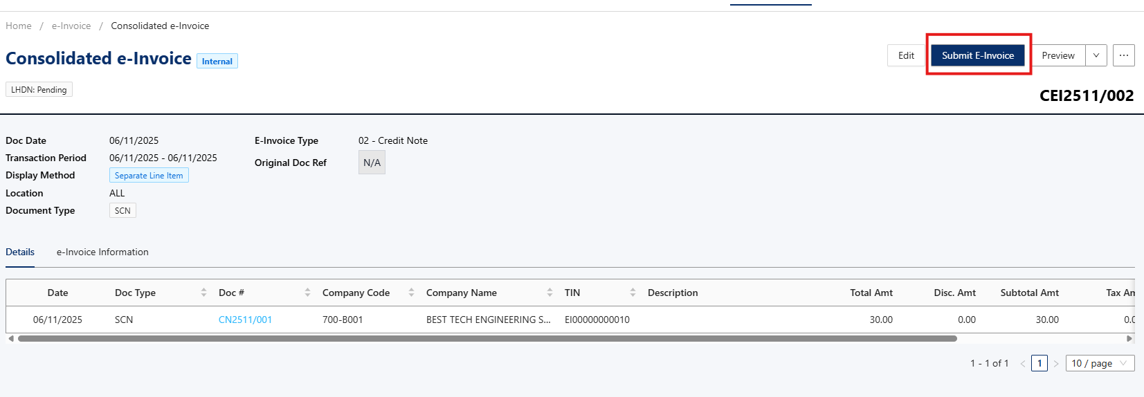 Specifically for Consolidated E-invoice, you’re required to issue consolidated credit note or consolidated debit note if there’s any changes need to be made.