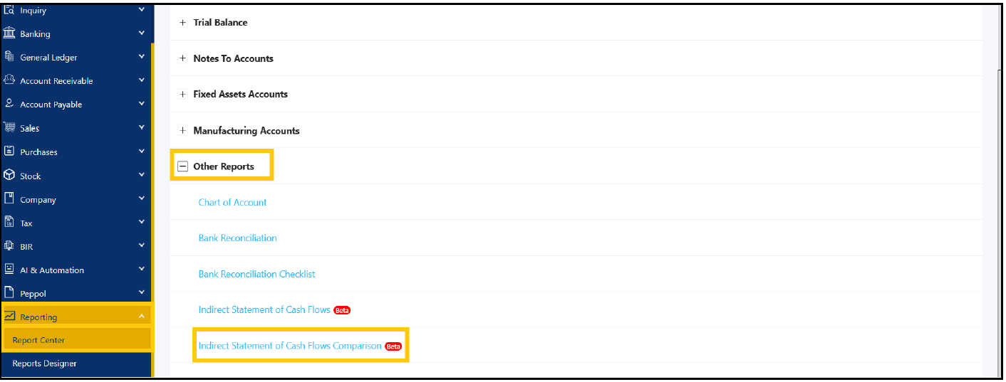 1. Navigate to the report. Go to Reporting > Report Center > General Ledger > Other Reports > Indirect Statement of Cash Flows Comparison.