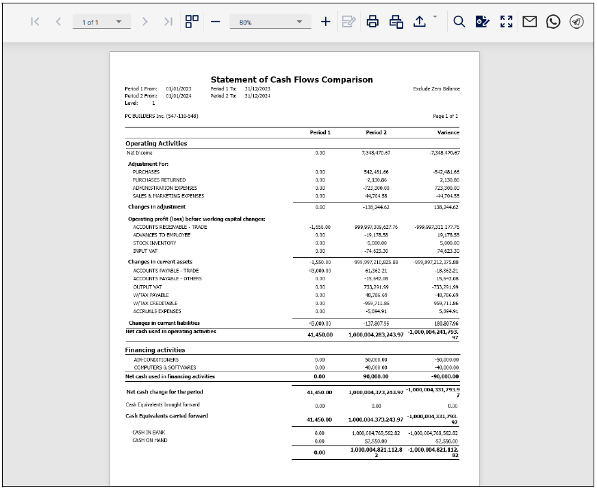 4. The report displays a comparative summary of cash flow activities across the selected reporting periods. Each section—Operating, Investing, and Financing—shows line items with values for Period 1, Period 2, and the Variance.Application: