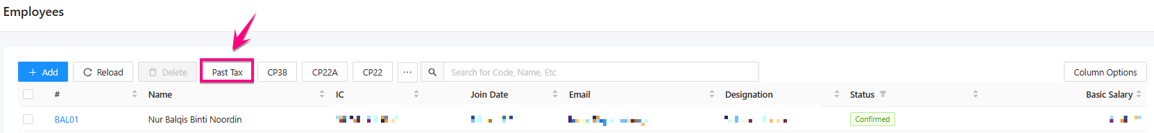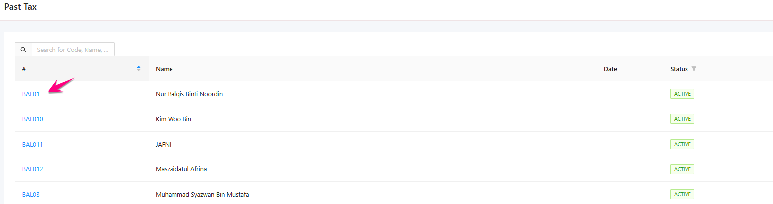 Step 3: Click on the Employee code for the staff member whose Past Tax information you want