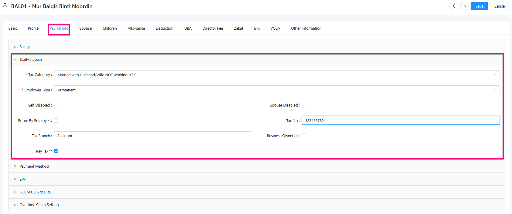 Step 2: Go to Employee > Payroll Info > Tax (Malaysia)