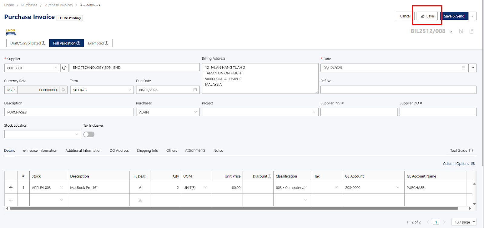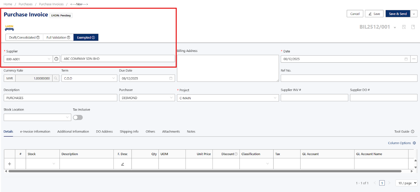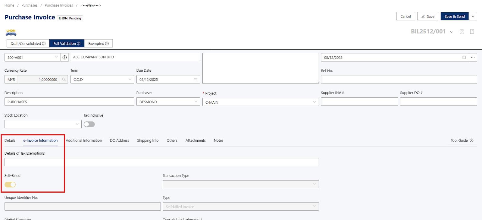 Note: The self-billed e-invoice must reflect the information exactly as if it were issued by your foreign supplier to ensure full e-invoice compliance.Once information has been provided in the Purchase Invoice, you can proceed to click on the Save Button.