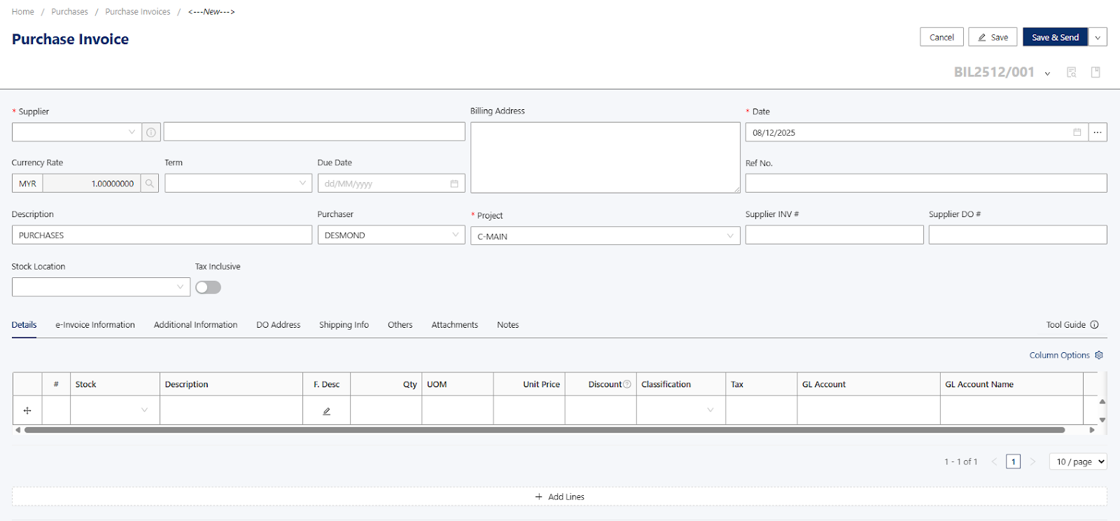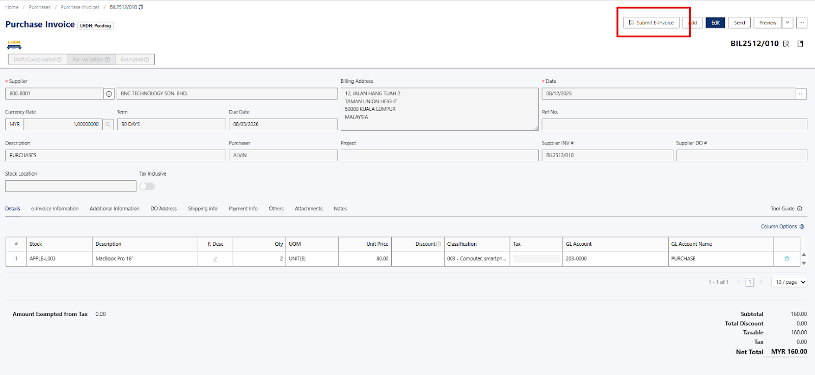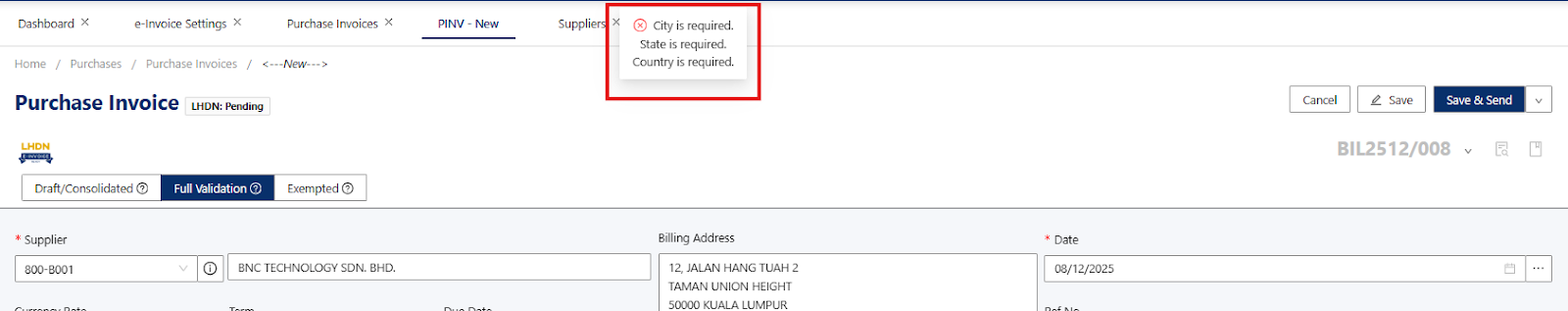 Note: The self-billed e-invoice must reflect the information exactly as if it were issued by your foreign supplier to ensure full e-invoice compliance.Once information has been provided in the Purchase Invoice, you can proceed to click on the Save Button.