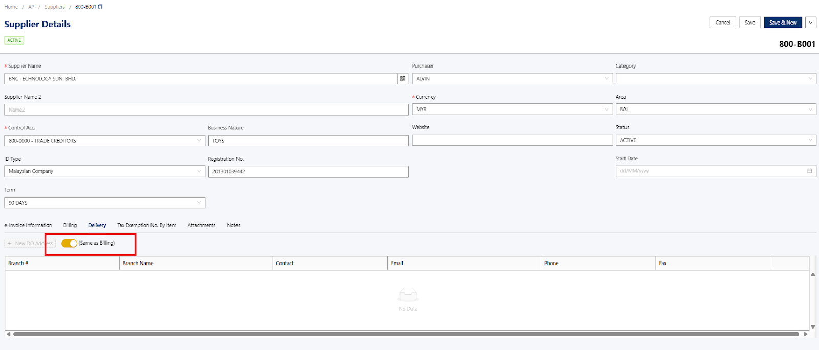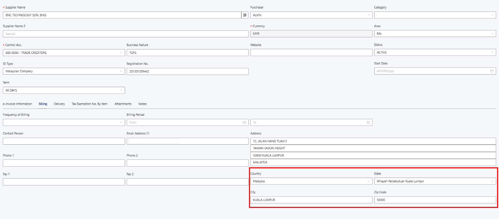 Supplier > Select the supplier > Edit > Billing