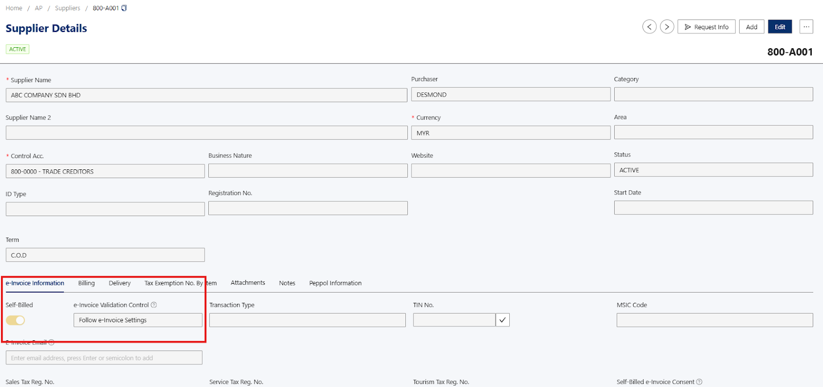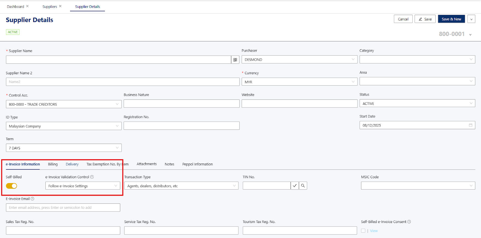 Example of Supplier with self-billed e-invoice toggle on:
