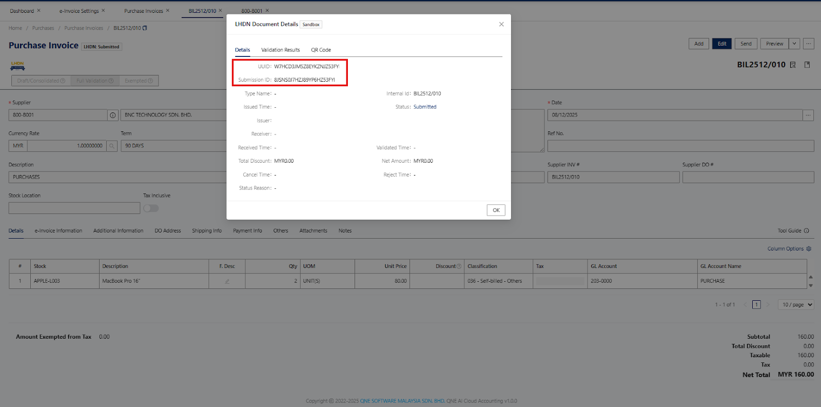 Once a document has been submitted and validated, you’ll be provided with UUID and Submission ID as document reference.