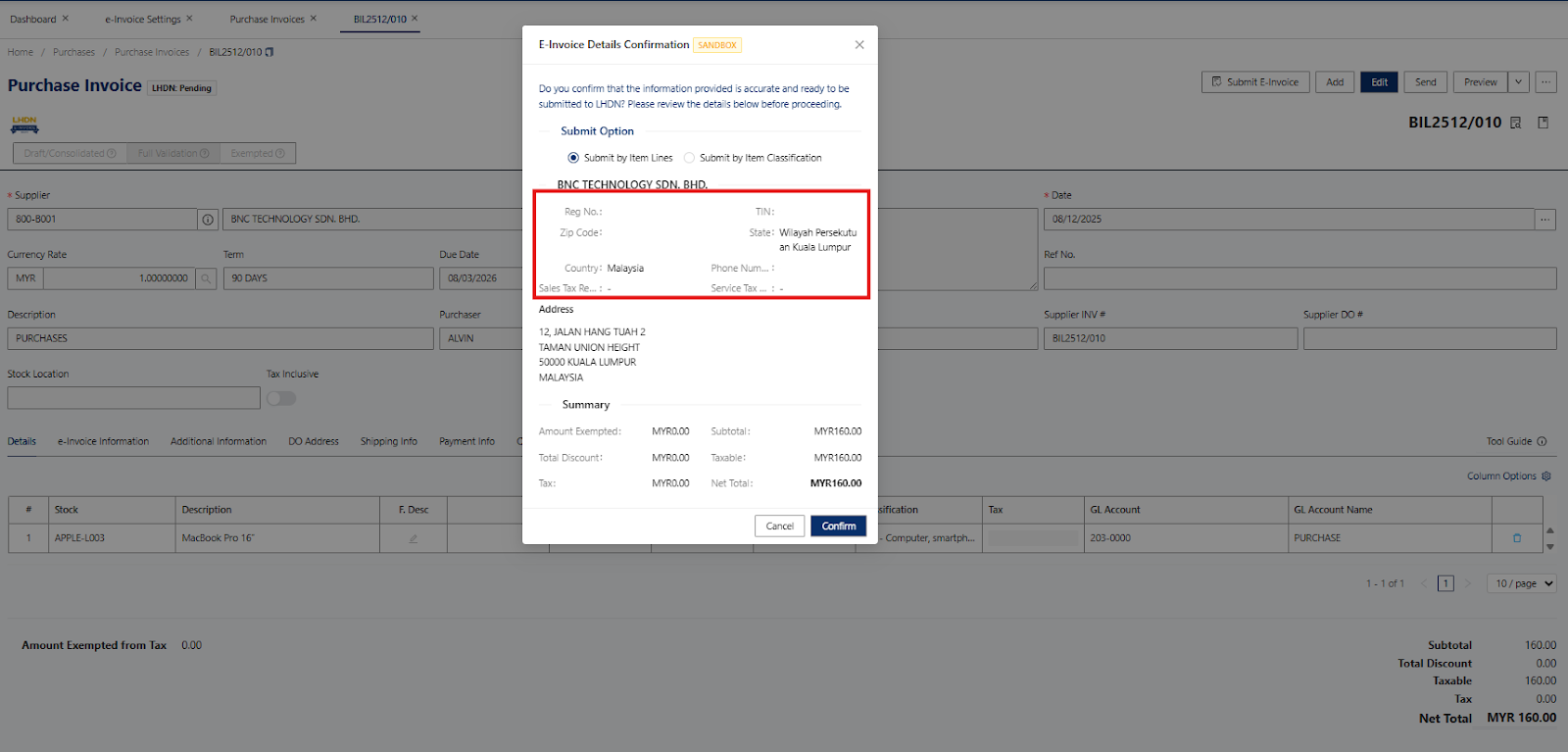 After clicking Submit E-Invoice, a pop-up box will appear to confirm the details. Review the information, then click Confirm to proceed.