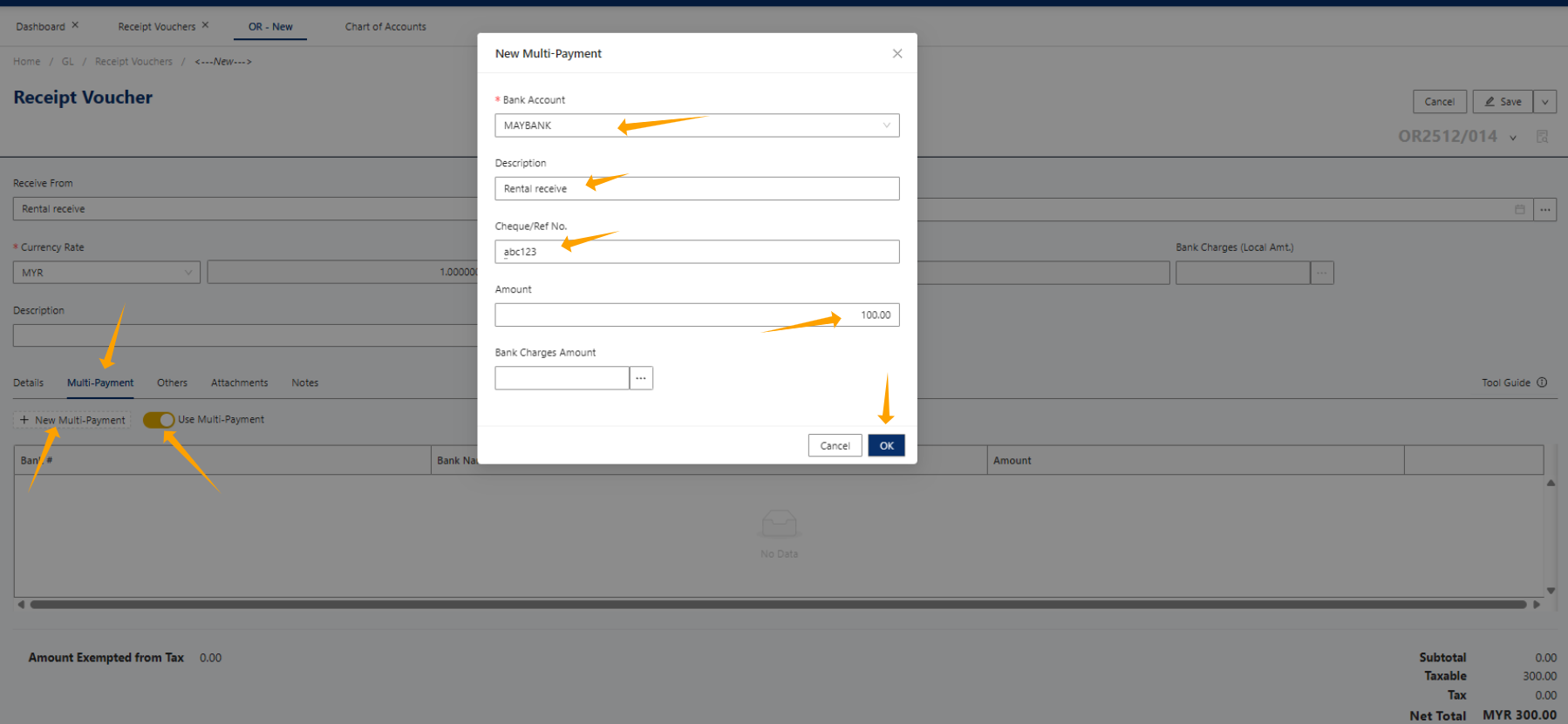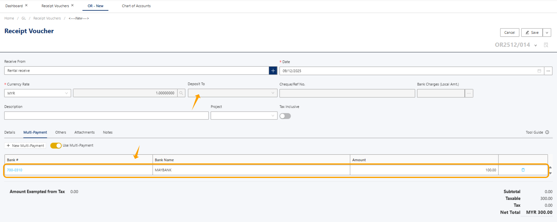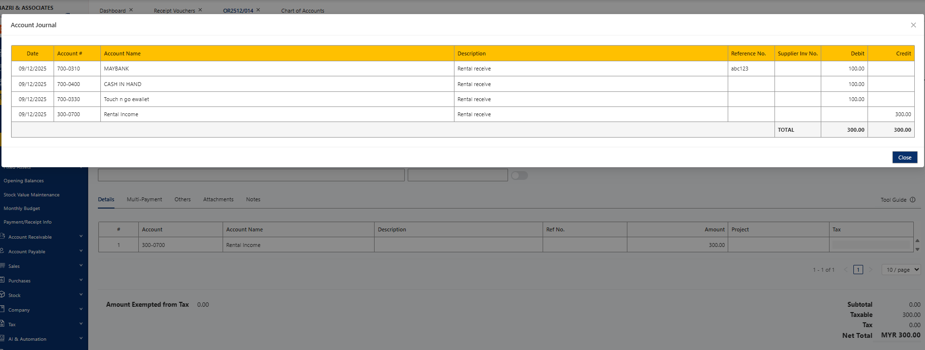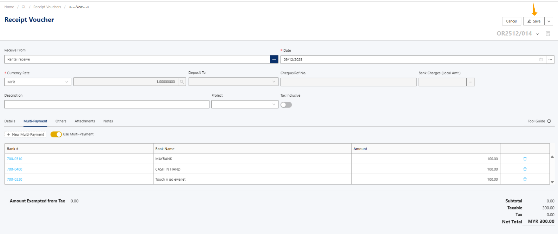 Now, let’s create a simple Receive Voucher. I will use a rental receipt as an example. Enter some basic information, such as Receive From, then select the GL Account (in this example, I chose the Rental Income GL account code). Finally, enter the amount of RM300.
