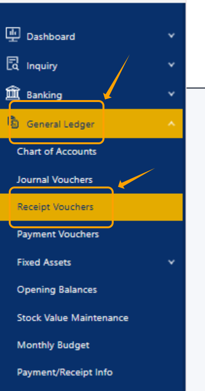 Step 1 — First, we will use the General Ledger as an example. Please expand General Ledger, then click Receive Voucher.