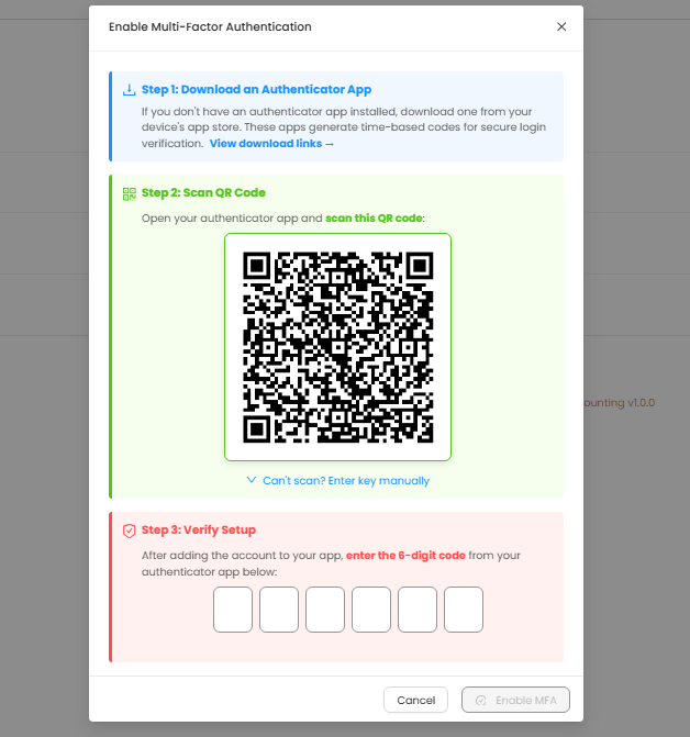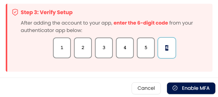 Click Enable MFA to finalize activation.