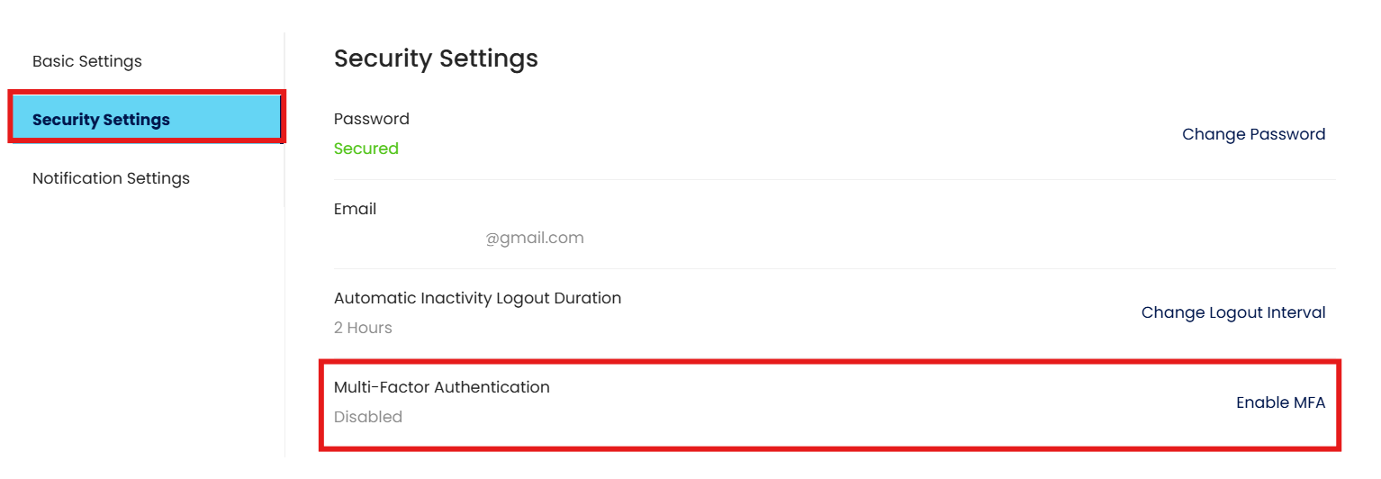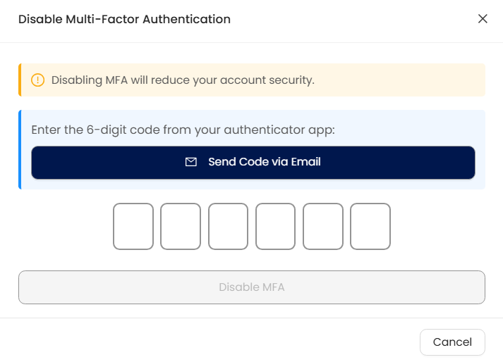 Note: Enabling or disabling Multi-Factor Authentication triggers a notification email to the user. This security feature is only available from the Essential Plan up to higher-tier plans.