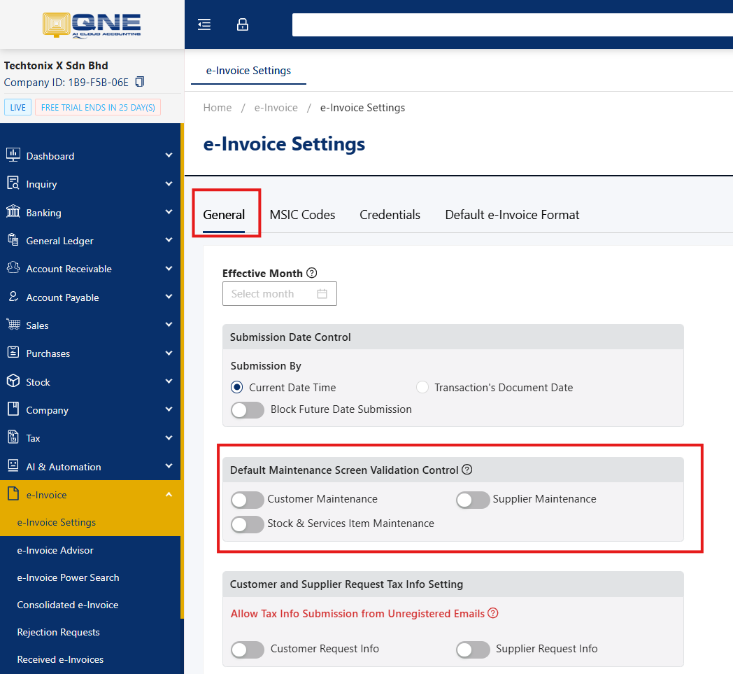 The Default Maintenance Screen Validation Control in QNE AI Cloud Account allows administrators to define whether validation is enforced when maintaining Customer, Supplier, and Stock & Services Item records that are relevant for e-Invoice compliance.