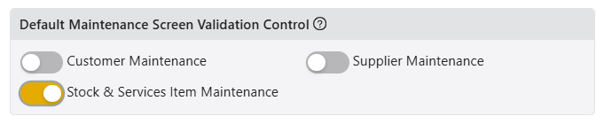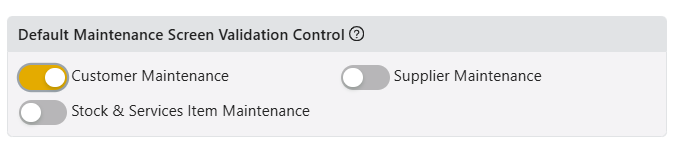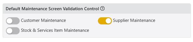 2. Enable validation for the relevant maintenance screens by toggling one or more of the following options: