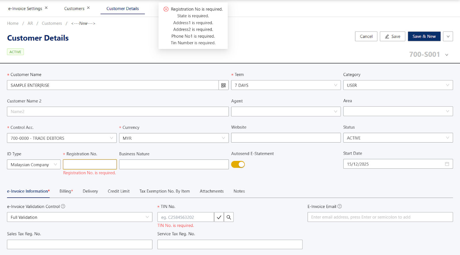 a. Customer Maintenance - Ensures required fields such as Customer name, TIN and related e-Invoice data are completed and validated.