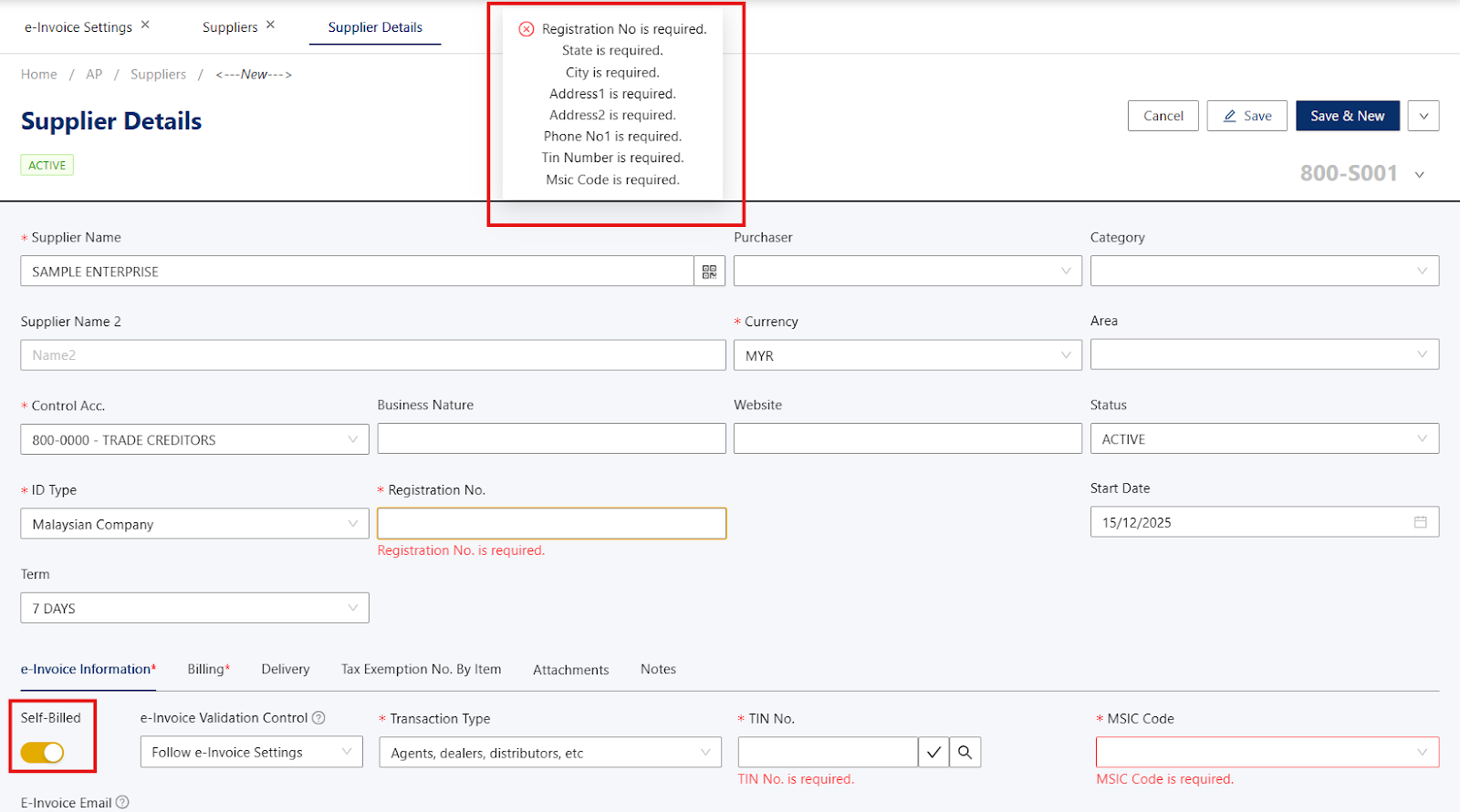 Diagram 2.b.i. shows the error prompt when you’re trying to create a new supplier in your database, whereby the self-billed option is toggle as open. The system will prevent you from saving the supplier creation if all relevant fields are yet to be filled in.