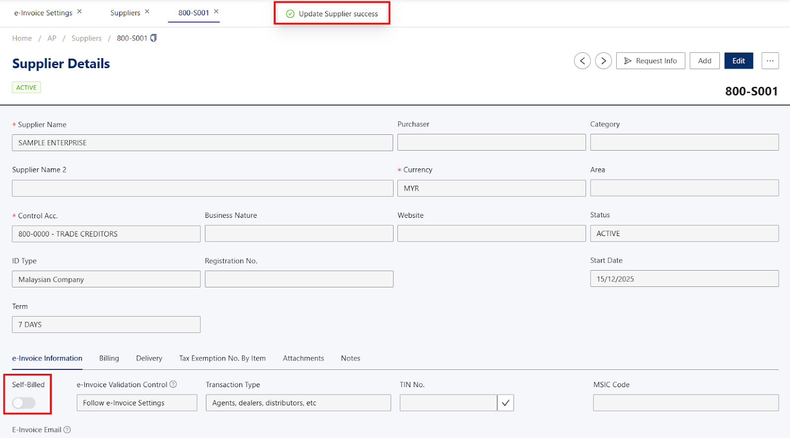 b. Supplier Maintenance - Ensures required supplier fields (such as business details, TIN, MSIC codes) meet standards. (NOTE: Supplier Maintenance validation is applicable only for self-billed suppliers. This function does not take effect for non-self-billed suppliers.)