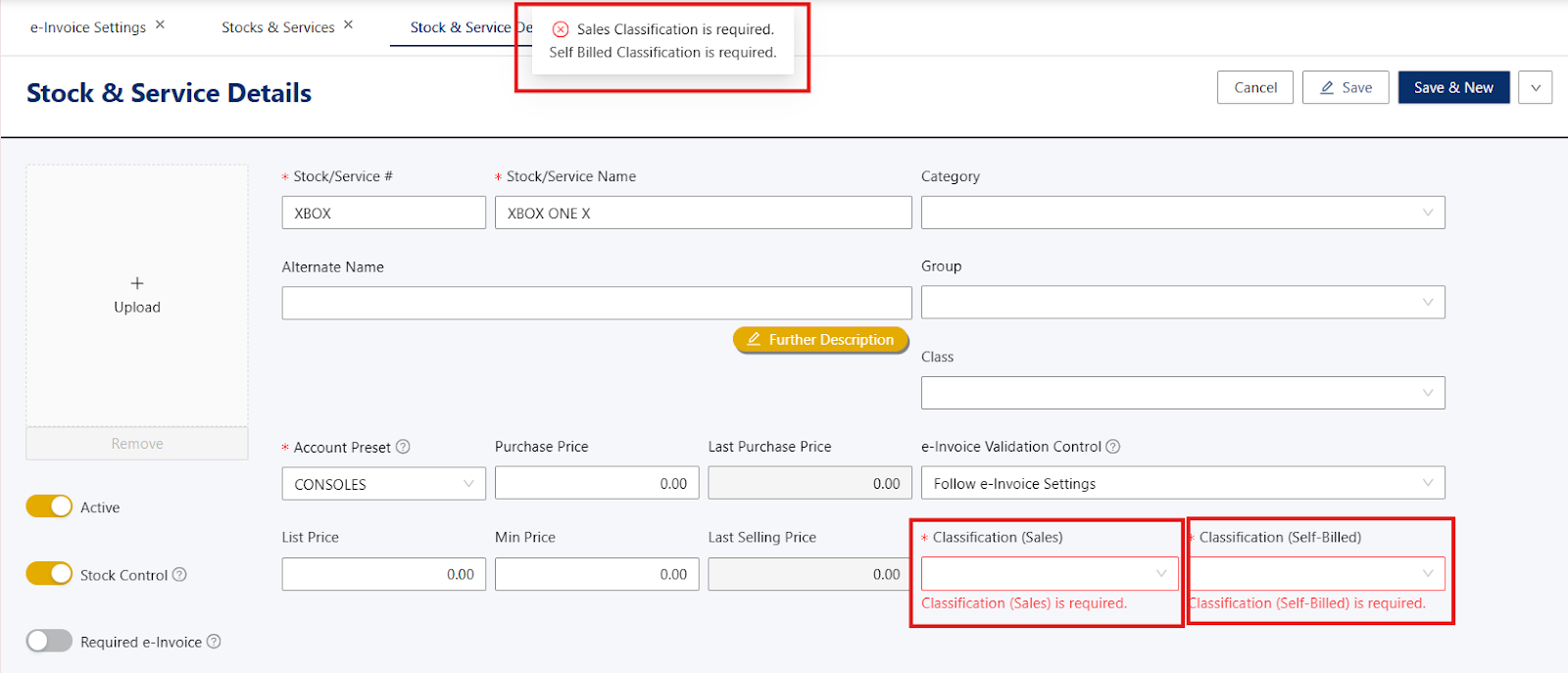 Diagram 2.c. shows the error prompt when you’re trying to create a new stock & services details in your database. The system will prevent you from saving the stock and/or services creation if all relevant fields are yet to be filled in.